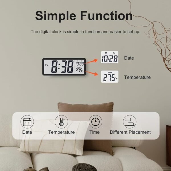 Beyond telling time, this clock features temperature, date, and week-day displays, all conveniently integrated into the large and clear screen. Stay organized and keep track of important details at a glance, making your daily routine smoother and more efficient.