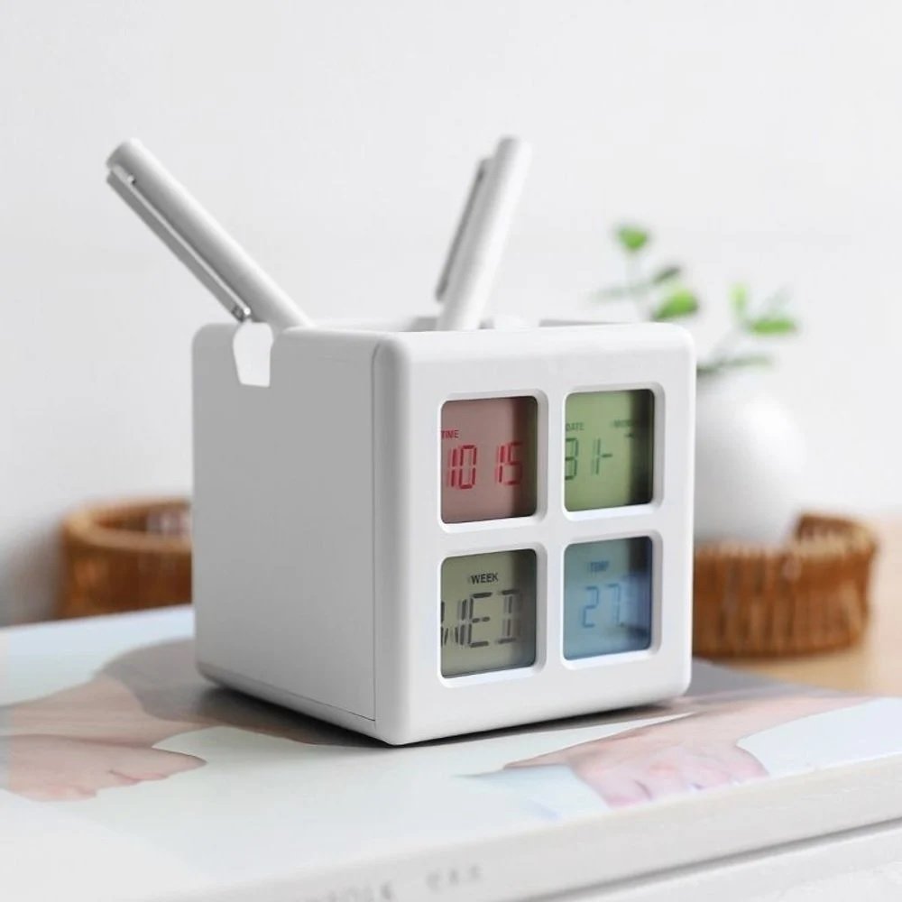 Enjoy the convenience of its multifunctional capabilities. This all-in-one device provides accurate temperature readings, a reliable calendar, and a customizable alarm to keep you organized and on schedule. The integrated pen holder ensures your essentials remain easily accessible, while its phone stand offers additional practicality for your daily needs.