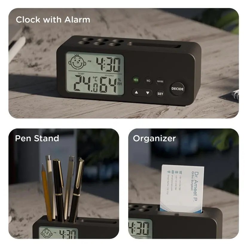 • Functions: Clock with Alarm, Decision Making Function, Temperature (C / F), Humidity Monitor (Hygrometer), Pen Stand, Card Holder.