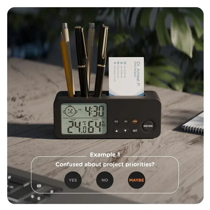 • Pen Stand & Visiting Card Holder: Maximize desk organization with our Decision Making Clock’s built-in pen stand and visiting card holder. Neatly store up to six pens and keep your business cards within easy reach, combining practicality with a sophisticated design element.