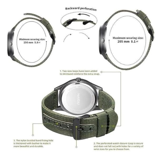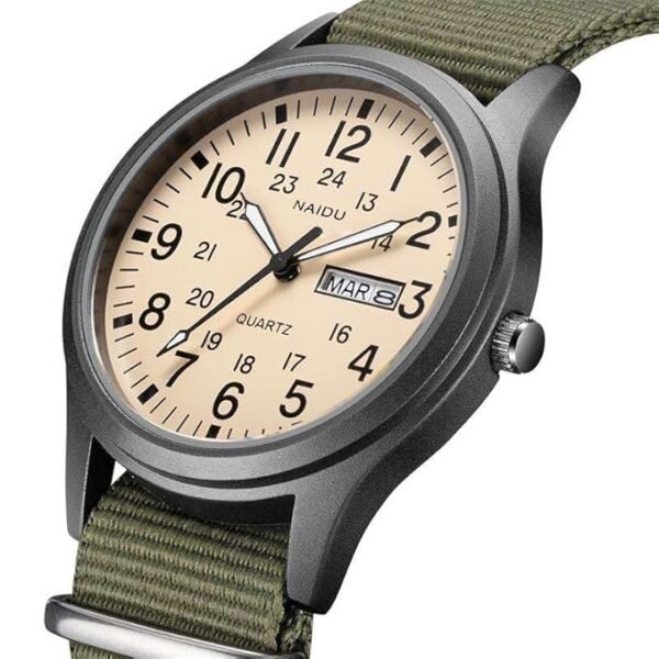 Discover the perfect blend of style and function with this round beige dial wrist watch. Its black case adds a bold contrast, while the nylon green strap offers a touch of understated sophistication, making it ideal for casual, formal, or outdoor occasions.